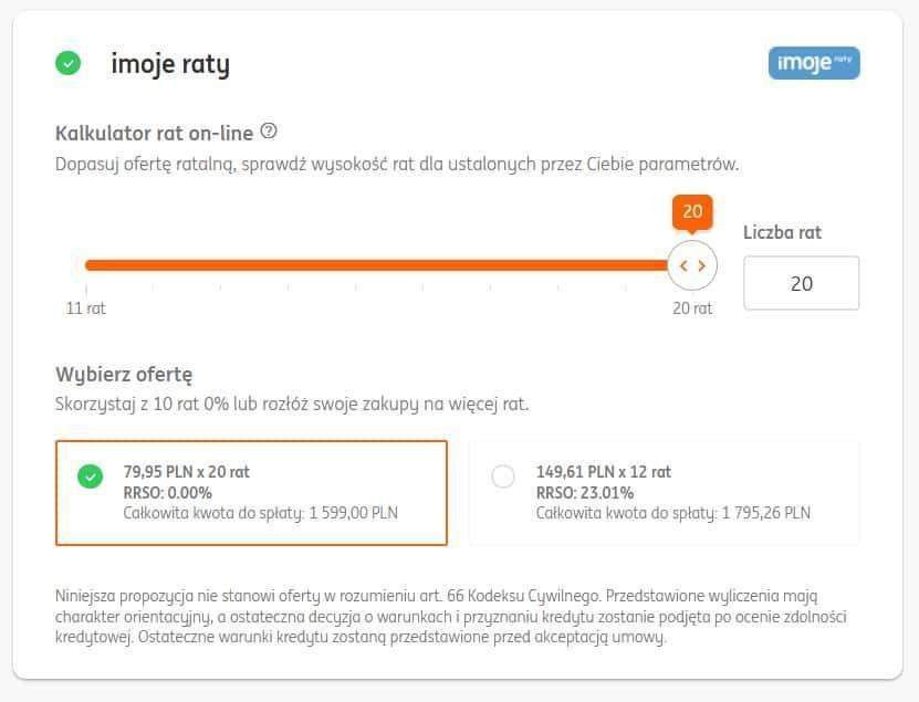 W ramach płatności iMoje dostępne są płatności ratalne w dwóch wariantach – raty 0%, dzięki którym nie ponosisz żadnych kosztów rozłożenia płatności na raty (RRSO 0%) oraz standardowe raty z oprocentowaniem, które pozwalają rozłożyć płatność na jeszcze dłuższy okres.